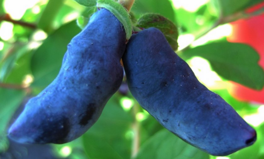 Цветки крупные, с глянцевой окраской . Ягоды жимолости Длинноплодная крупного размера (массой от 0,9 до 2 граммов, в длину — до 2,7 см, диаметром — 0,8 см), слегка сжатые с боков, удлиненно-плоской . . .