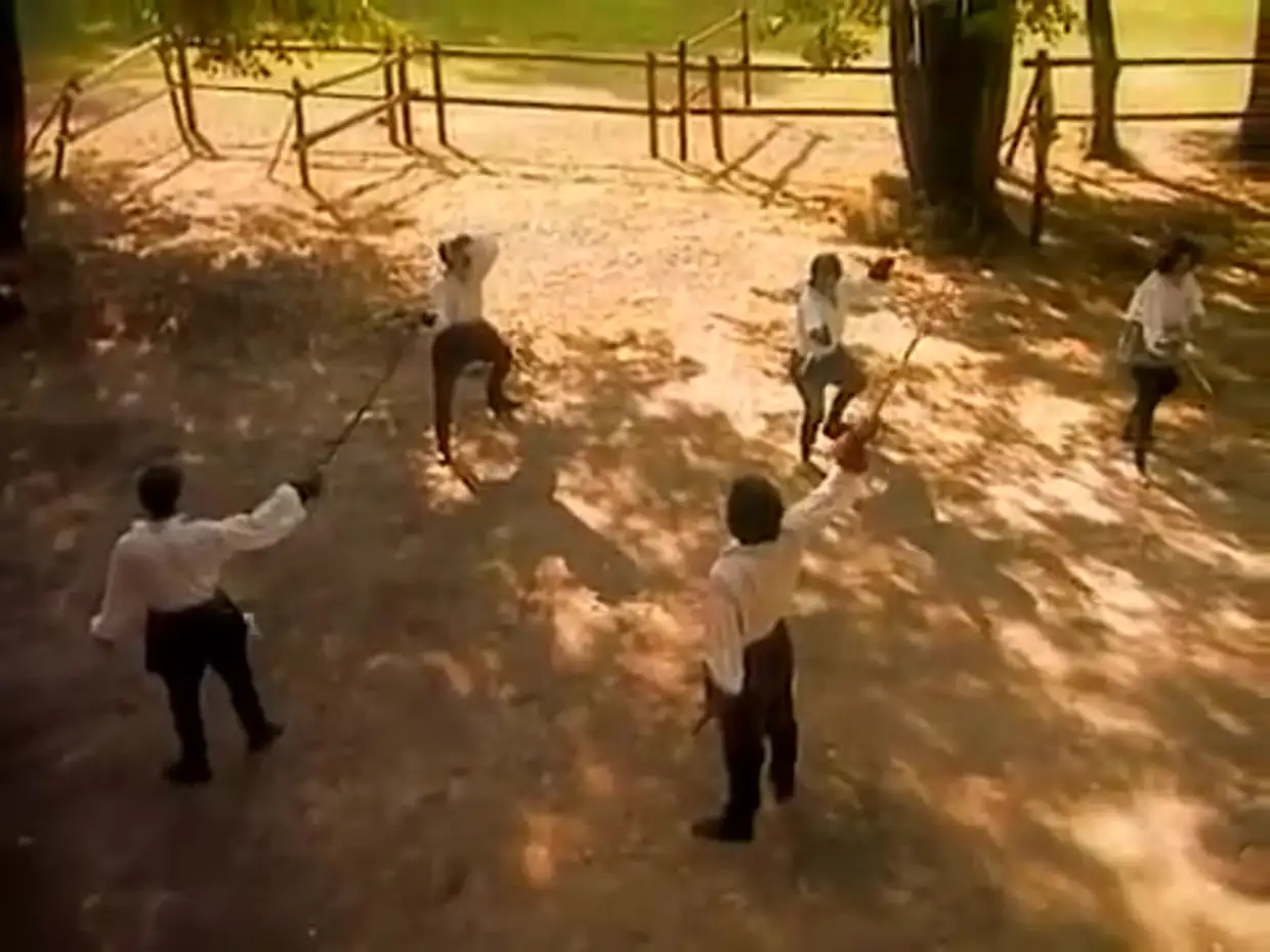 Но накануне дуэли графа де Бюсси убивают в доме его возлюбленной, графини де Монсоро и герцог д'Эпернон остаётся без противника . Дальнейший ход событий известен, почти все противники убивают друг друга . В живых останется только Антраге и Келюс . . .