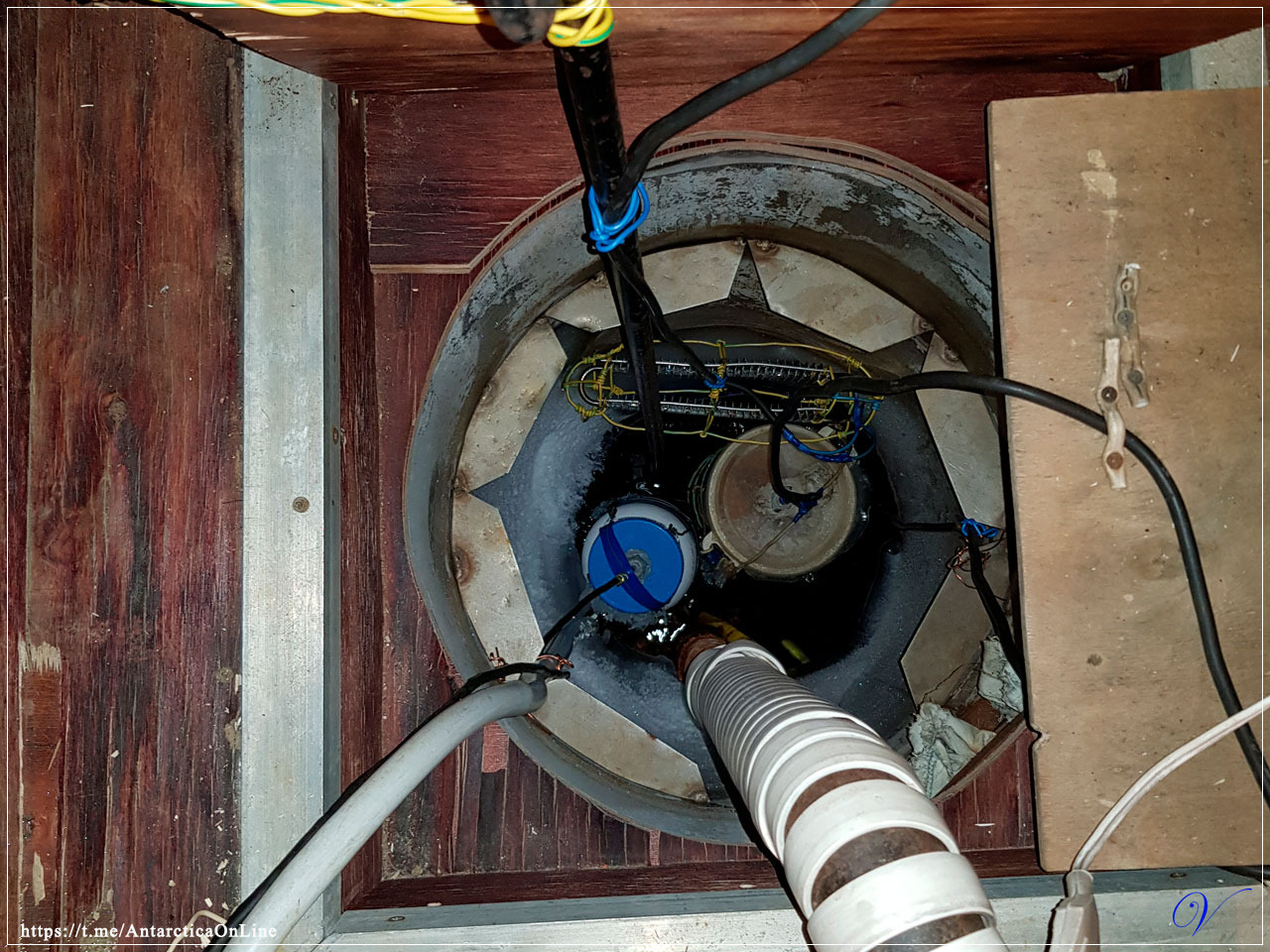 (На фото водозаборная лунка, из которой поступает на станцию питьевая вода. Труба обмотана обогревательным элементом который не дает замерзнуть лунке.)
