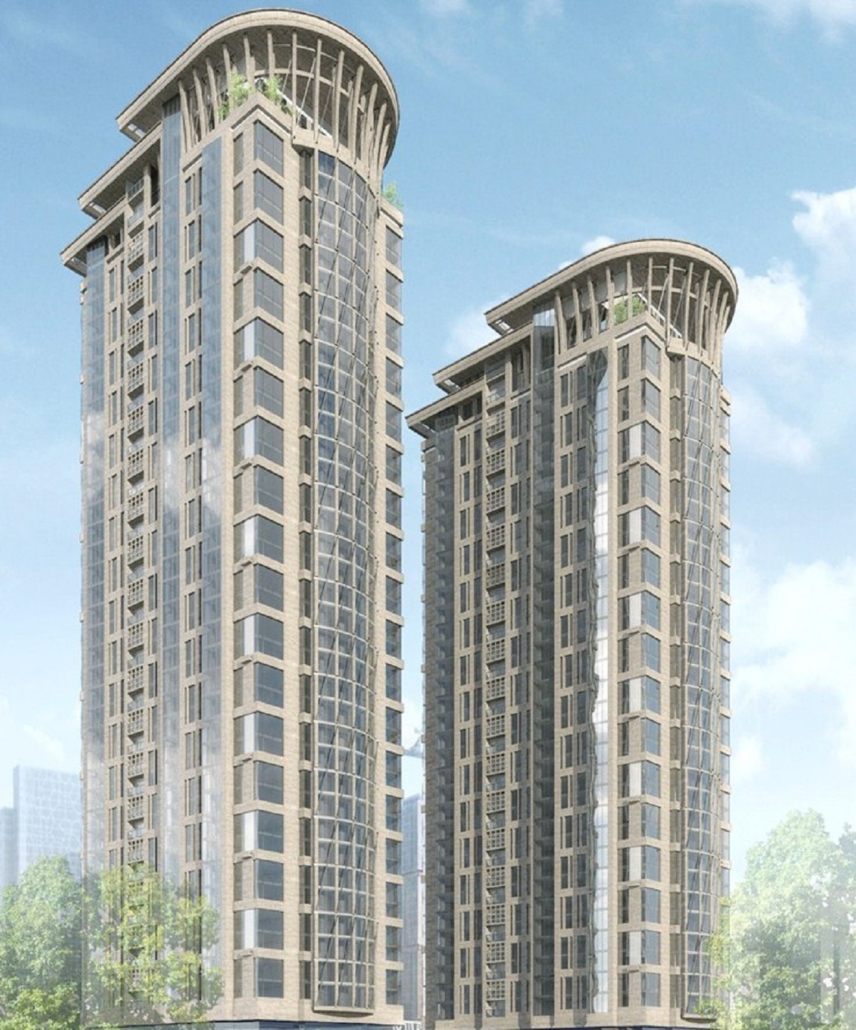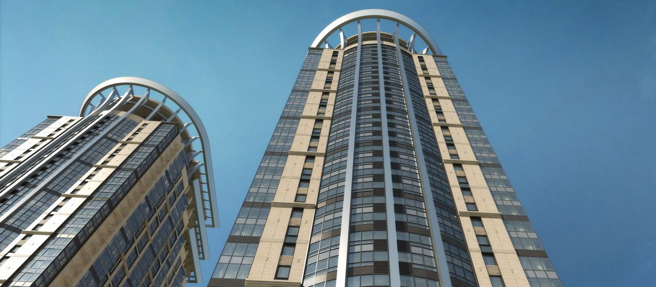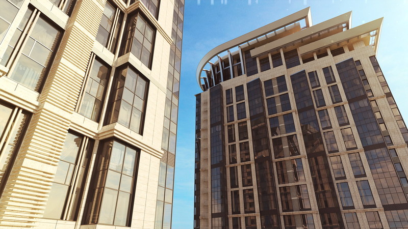 ЖК Долина Сетунь - закрытый жилой комплекс премиум класса от АрхИнж . Фасады в стиле Art Deco из натурального мрамора и травертина . На верхушках зданий дизайнерские короны .