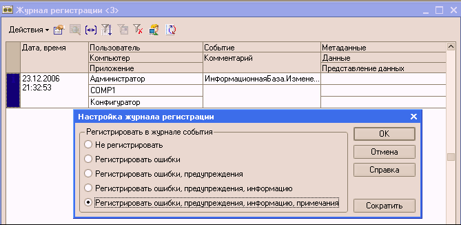 Журнал действий в 1с