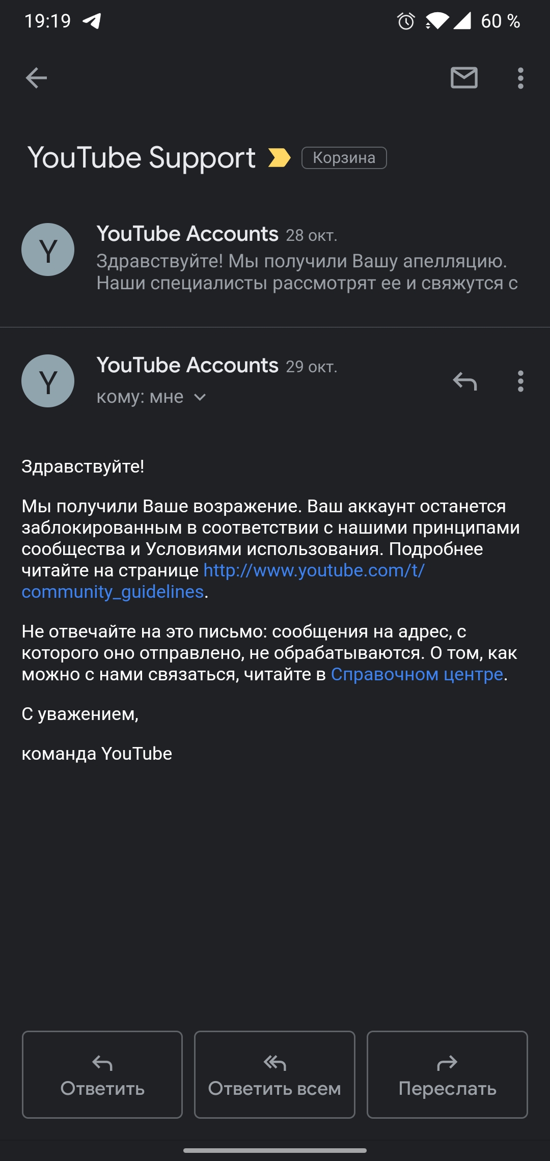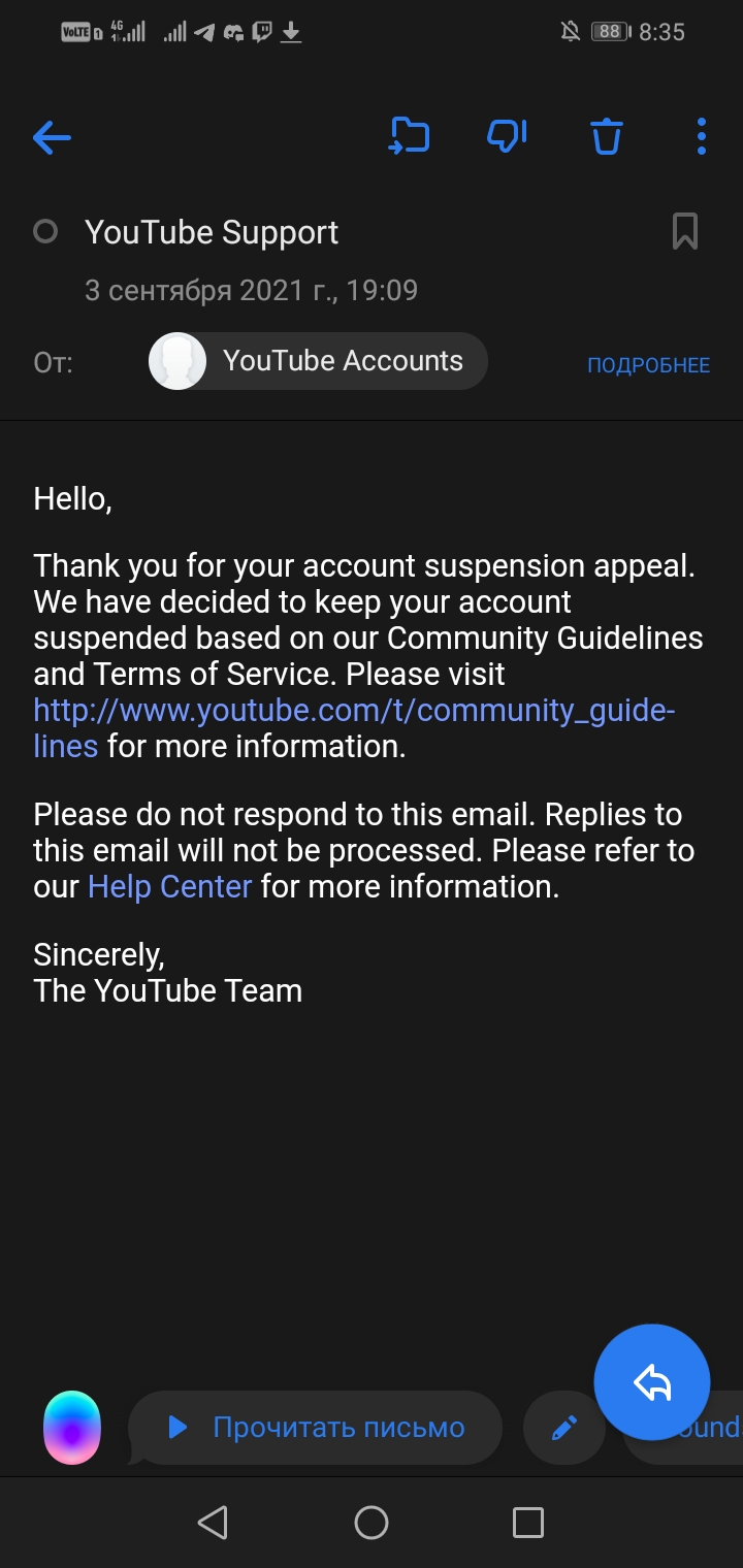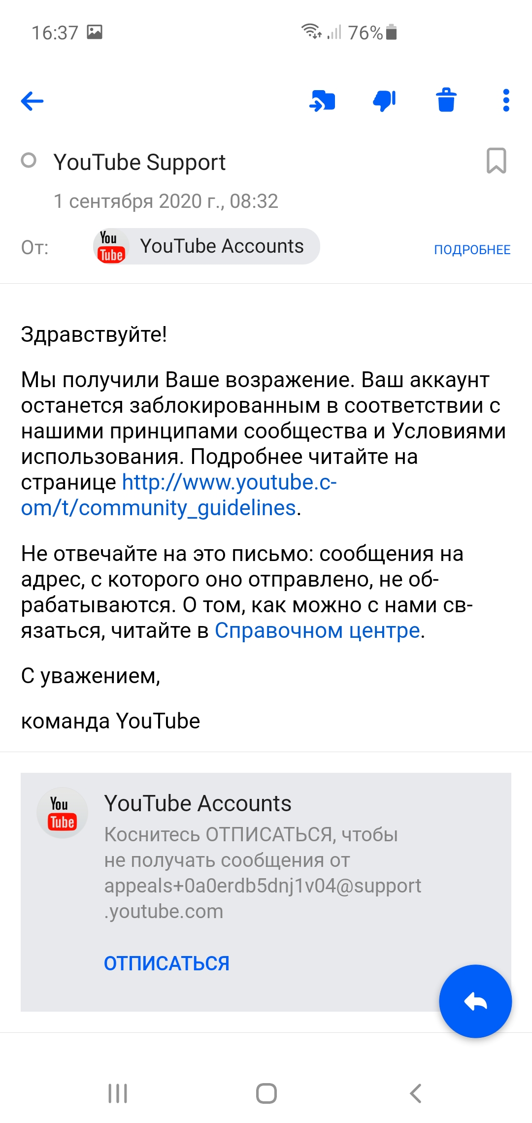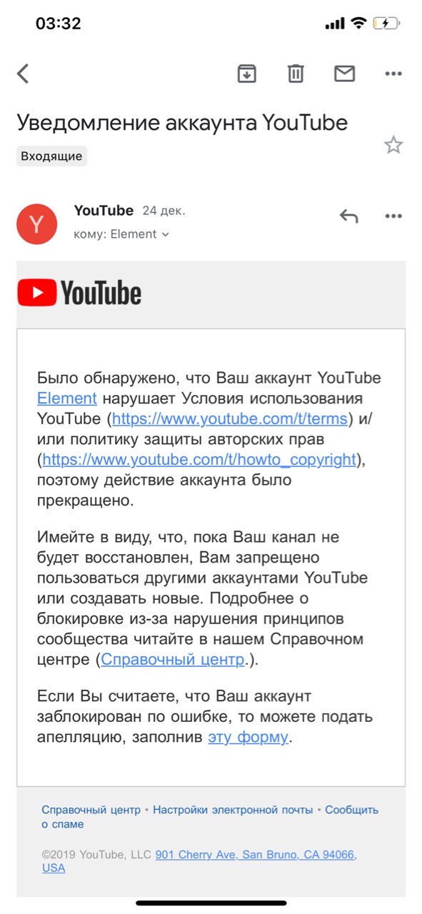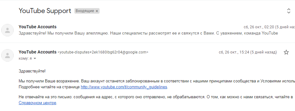 Забанили ютуб аккаунт