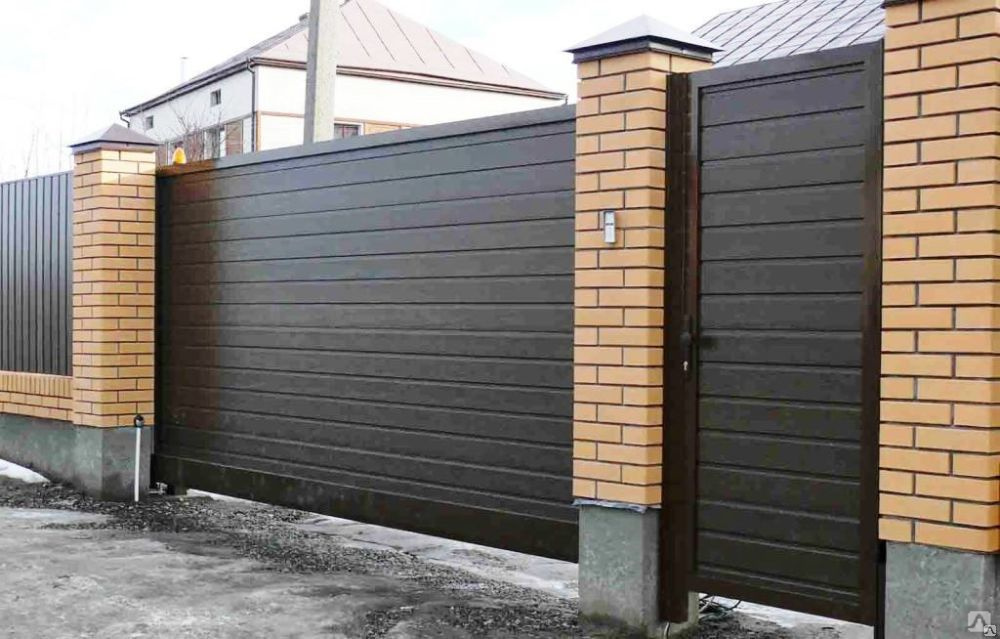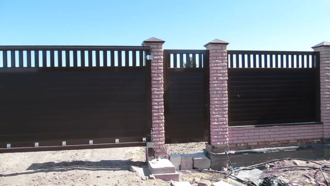Фото деревянных заборов . . . . Забор из евроштакетника на ленточном фундаменте с кирпичными столбами . . . Откатные ворота из сэндвич панелей; Откатные ворота на винтовых сваях . . .