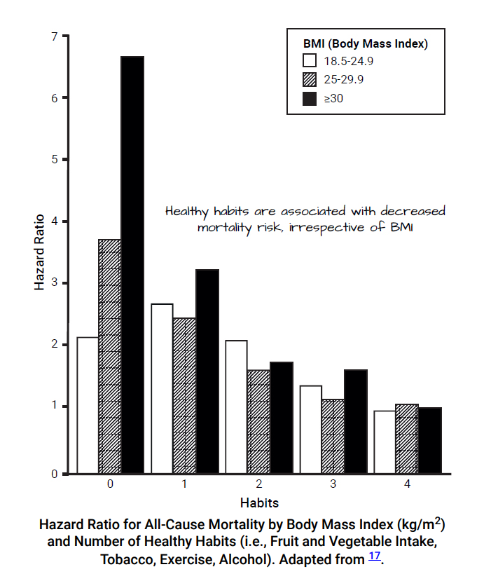 Было обнаружено, что соблюдение этих привычек снижает риск смертности, независимо от массы тела, т.е. вы можете улучшить свое здоровье, не изменяя при этом свой вес. То, как именно многие люди худеют, как бы намекает, что их не очень-то волнует вопрос здоровья. Постоянные скачки веса (резкое похудение и такой же резкий набор на «срывах»), мусорные БАДы, жесткие диеты. На фоне всего этого настоящей заботой о здоровье будет забыть про вес и сосредоточиться на выстраивании новых здоровых привычек.