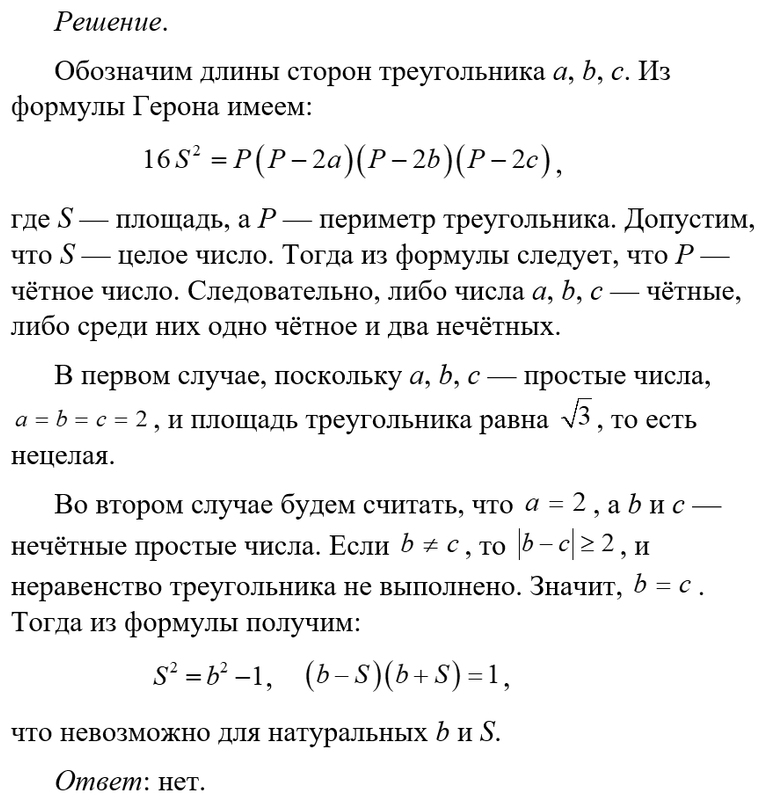 Задача 10 Длины сторон треугольника — простые числа. Может ли его площадь быть целым числом? Математическая эссенция