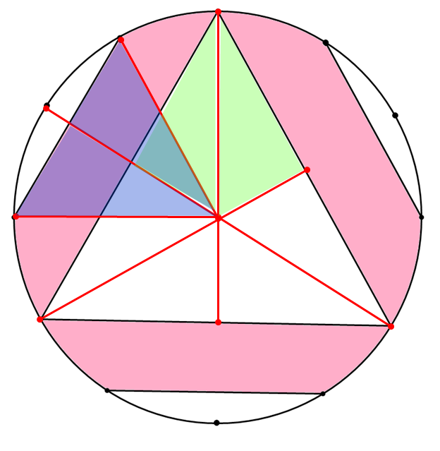 Медианы вписанного правильного треугольника разбивают его на шесть равных треугольников. Два из таких треугольников (покрашены в зелёный цвет) заменим на два равных им синих. Проделаем аналогичные действия для двух пар других треугольников и других сторон рассматриваемого правильного треугольника. Получим, что белая (не закрашенная) часть фигуры заменена на три сектора с центральным углом 60°, а значит, образует половину площади круга.