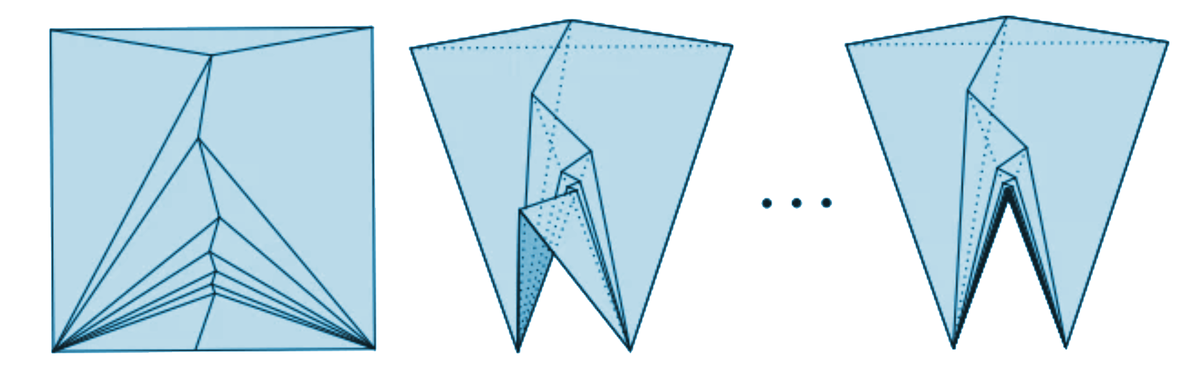 Журавлика складывают из специальной заготовки, из двух концов которой делаются два крыла, а два другие «утоньшаются», из них получаются хвост и шея. Если же эту «операцию утоньшения» применить дважды к каждому большому концу, то заготовку можно будет выложить на плоскости так, что периметр превысит периметр исходного квадрата — увеличится примерно на 0,5%. Если операцию «утоньшения» проводить много раз, то в пределе можно добиться увеличения периметра на (√2 – 1) ≈ 41,4%. (Практическую неосуществимость таких операций, связанную с необходимостью сгибать лист сразу в огромном числе мест мы не принимаем во внимание.)