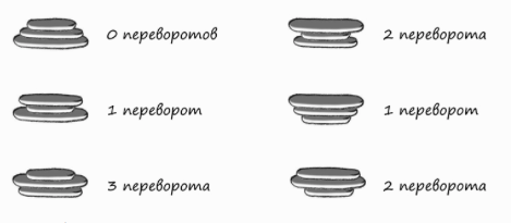 «В нашем ресторане не очень аккуратный шеф-повар; когда он готовит блины, они получаются разных размеров. Вот почему, когда я отношу блины клиенту, по пути к столику мне приходится переворачивать несколько верхних блинов (так, чтобы самые маленькие были наверху, а самые большие — внизу). Я повторяю это столько раз, сколько нужно (меняя количество переворачиваемых блинов). Если есть n блинов, чему равно максимальное количество переворотов (как функции n), которое мне придется сделать, чтобы расположить блины в правильном порядке?
