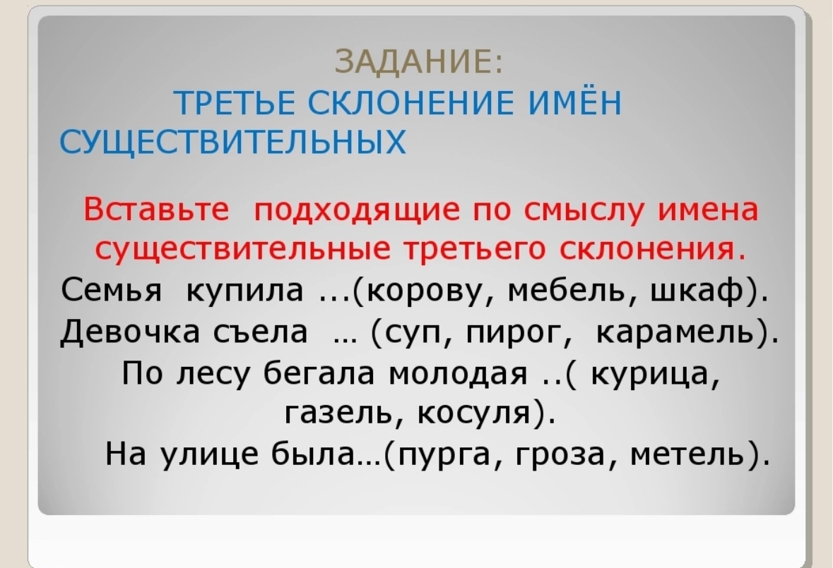Задание на определение склонения существительных 100 фотографий