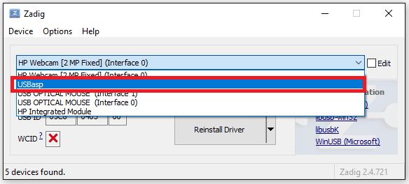 Zadig драйвера