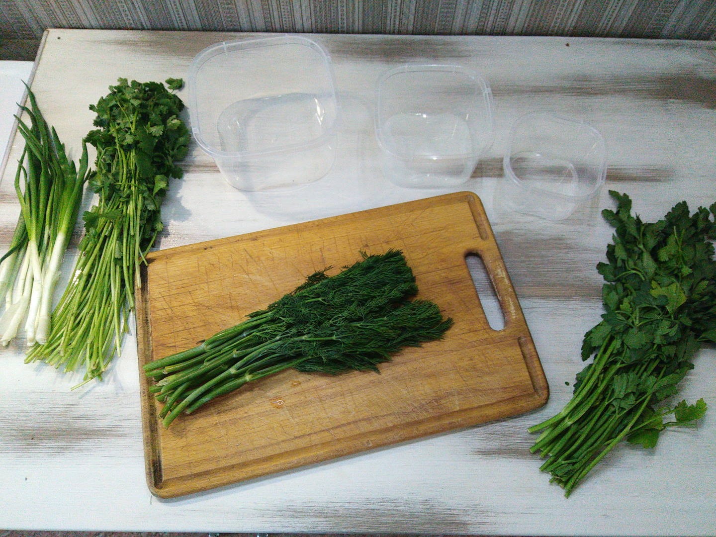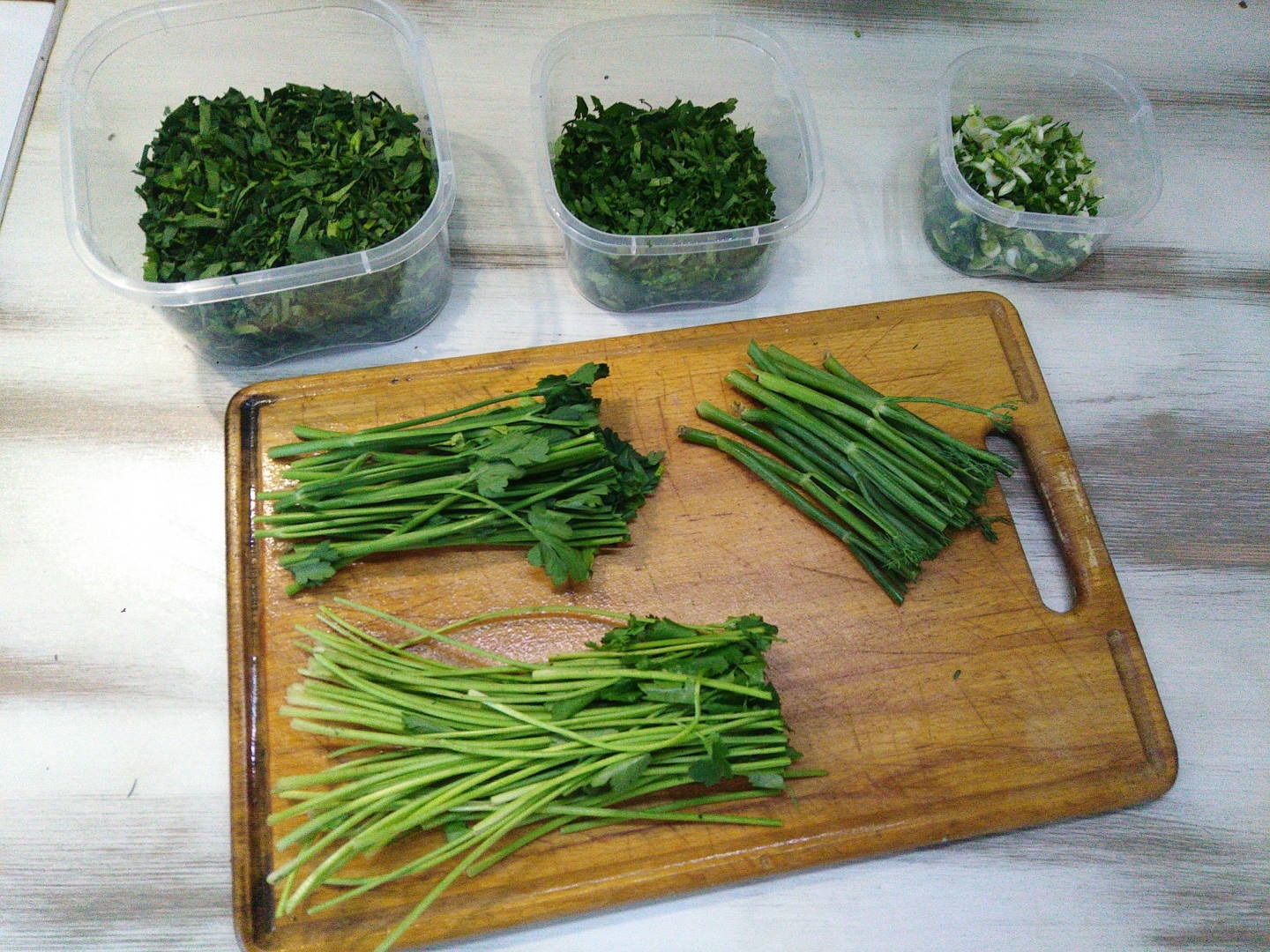 Вам понадобится острый нож, несколько контейнеров и хорошая морозилка — если ваша морозит долго или недостаточно хорошо, то зелень успеет почернеть и испортиться.