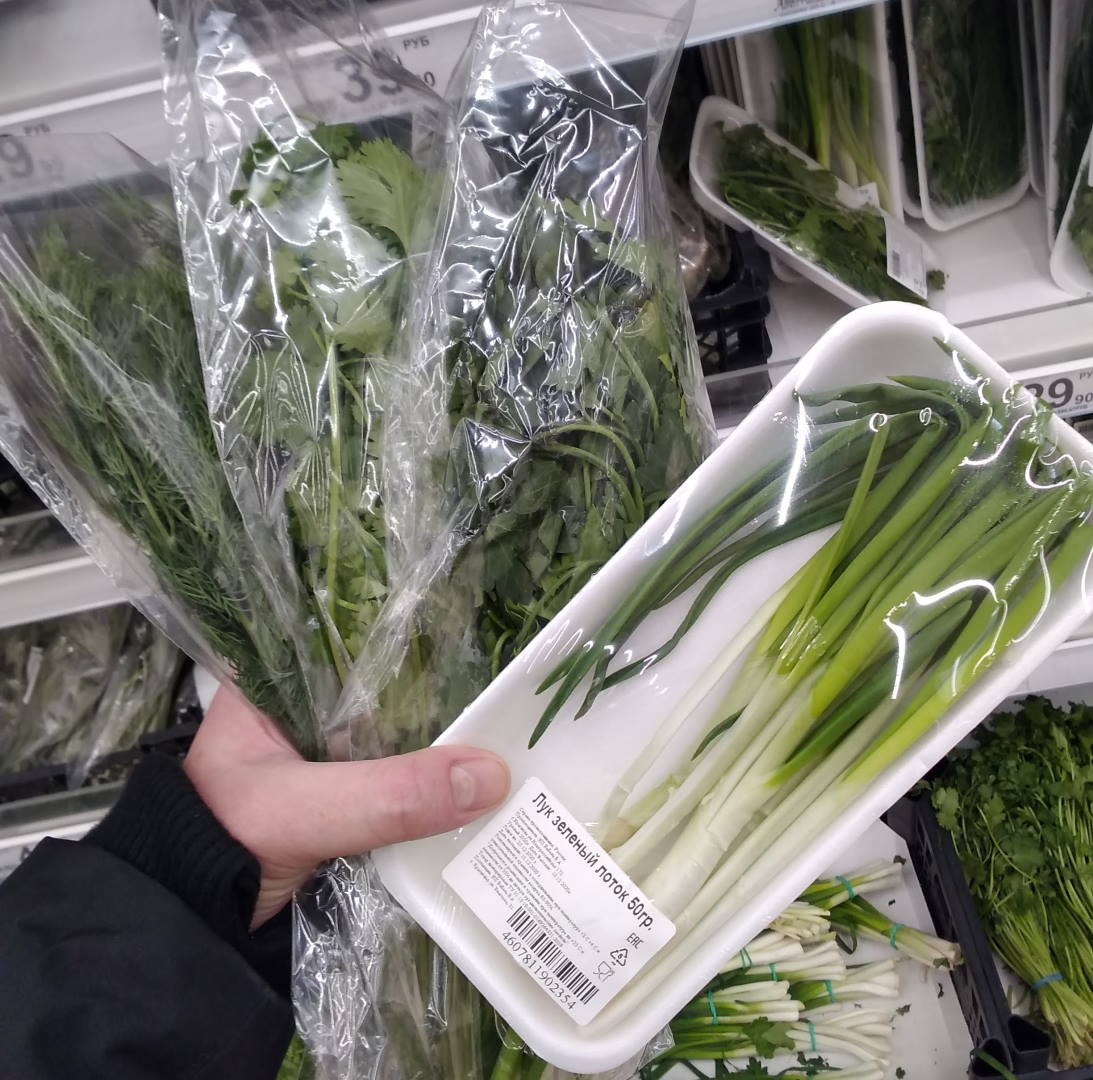 Отбираем хорошие и сухие пучки зелени. В некоторых магазинах они стоят под спринклерами — это не очень здорово, так как такая зелень переувлажнена и быстро завянет без воды, а еще ее придется обсушить перед шинковкой. Также выбирайте пучки без черных пятнышек и почерневших побегов — это свидетельствует о том, что зелень была переохлаждена и также быстро испортится.