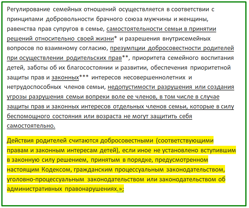 ** презумпция добросовестности ниже раскрывается со слов «Действия родителей считаются добросовестными...» (выделено желтым).