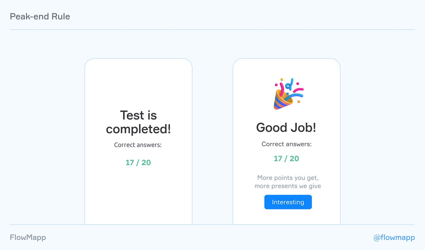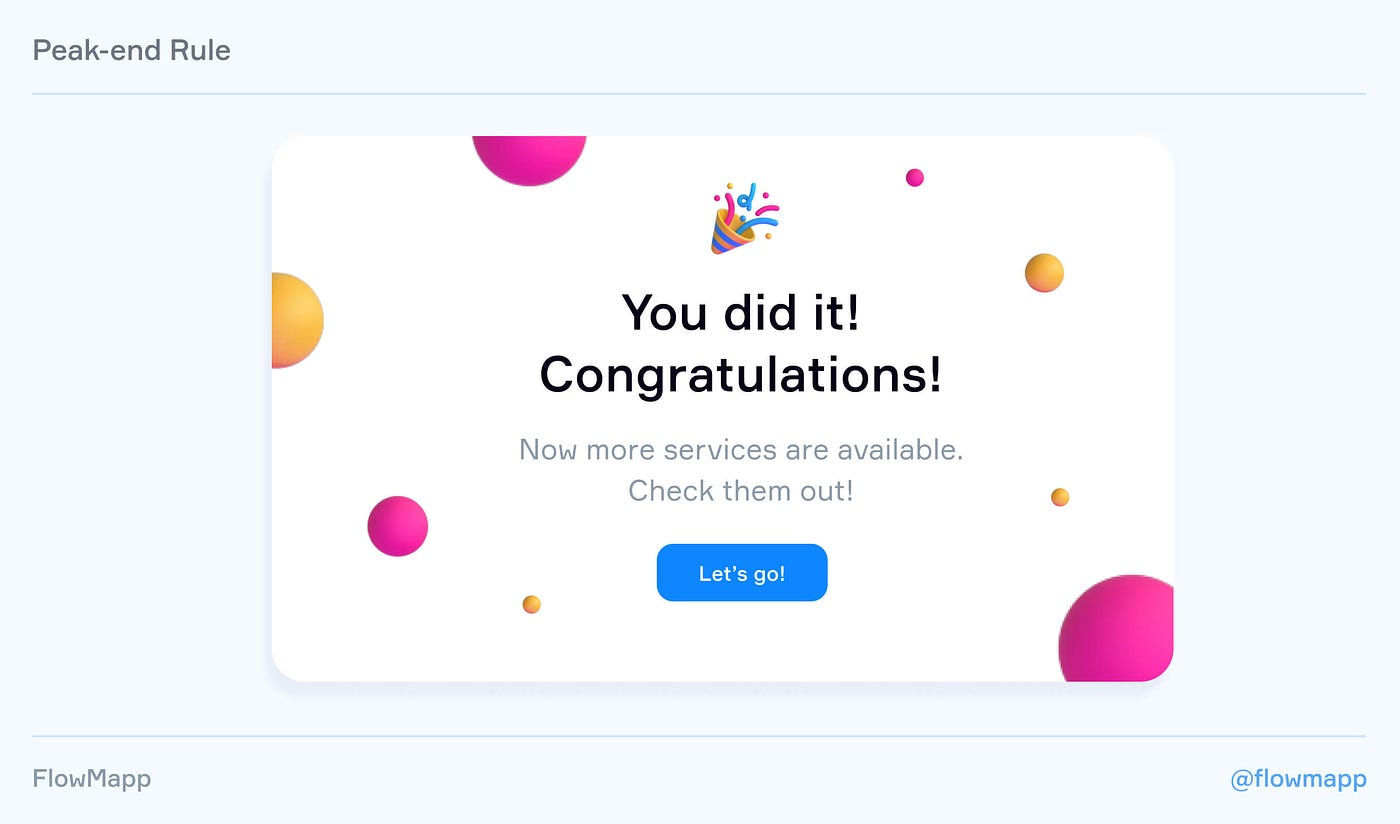 Допустим, у вас есть сложная форма с 20 шагами. Чтобы пользователи чувствовали себя комфортно, вы можете включить автозаполнение и автокоррекцию, разделить эти шаги на категории, добавить встроенные сообщения об ошибках и так далее. Вот как вы можете устранить отрицательные пики. Но когда для завершения какого-либо процесса требуется много времени и действий, ваша цель — заставить пользователя забыть об этом. И здесь может пригодиться хорошая заключительная часть.