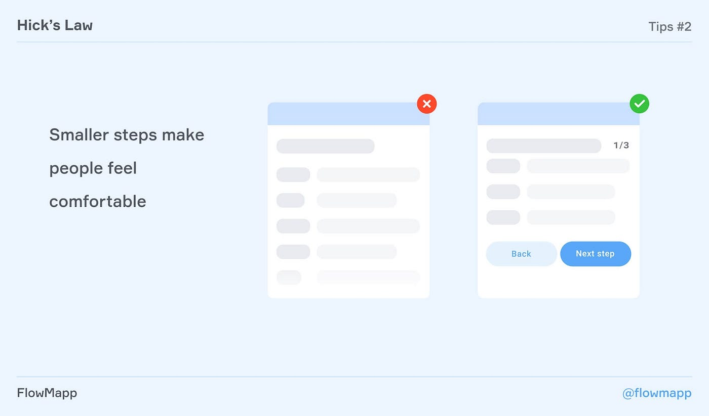 Пример: Представьте, что вы регистрируетесь на новом сайте и вам нужно заполнить длинную форму с множеством полей. Скорее всего, вы запутаетесь и можете ошибиться. Лучше разбить форму на несколько шагов по 3-5 полей в каждом.