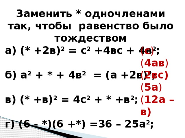 Замените одночленами так чтобы получилось тождество