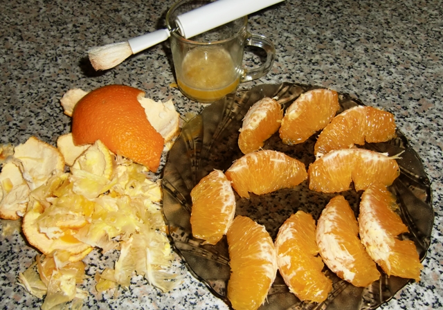 Апельсин — 2 штуки, мед — 4 ст . ложки, корица — 1 чайная ложка, орехи грецкие — 20-30 грамм (очищенные) . Подготовьте все необходимые ингредиенты . Апельсины очистите от шкурки и белых пленок, разделите на дольки .