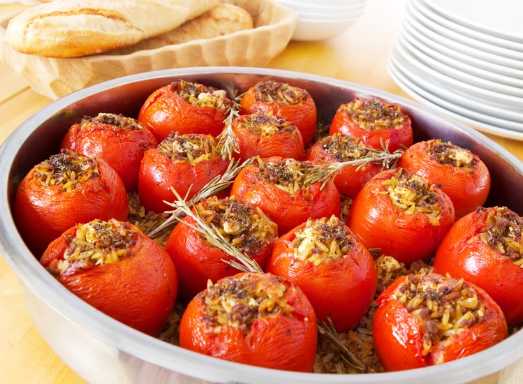Запеченные фаршированные помидоры с мясной, овощной начинкой или же с креветками, сыром и ветчиной прекрасно будут сочетаться со свежей зеленью и основным мясным блюдом .
