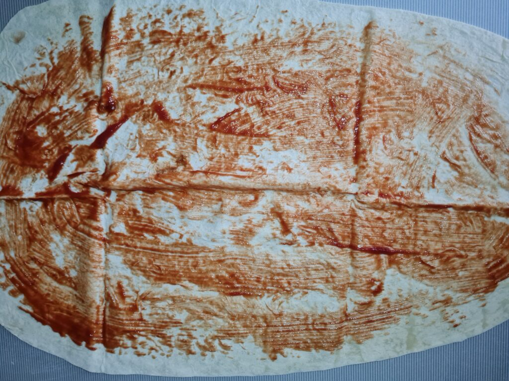 3. На столе развернуть лист лаваша. Смазать его кетчупом.