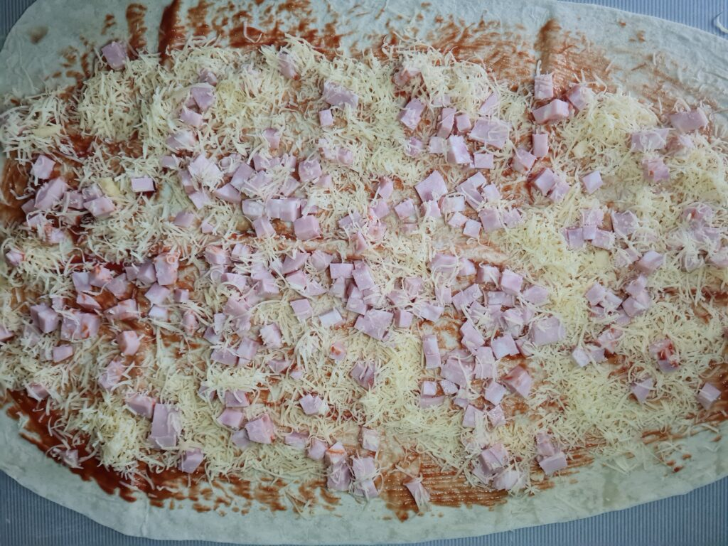 4. Сверху на лаваш положить ветчину и тёртый сыр.