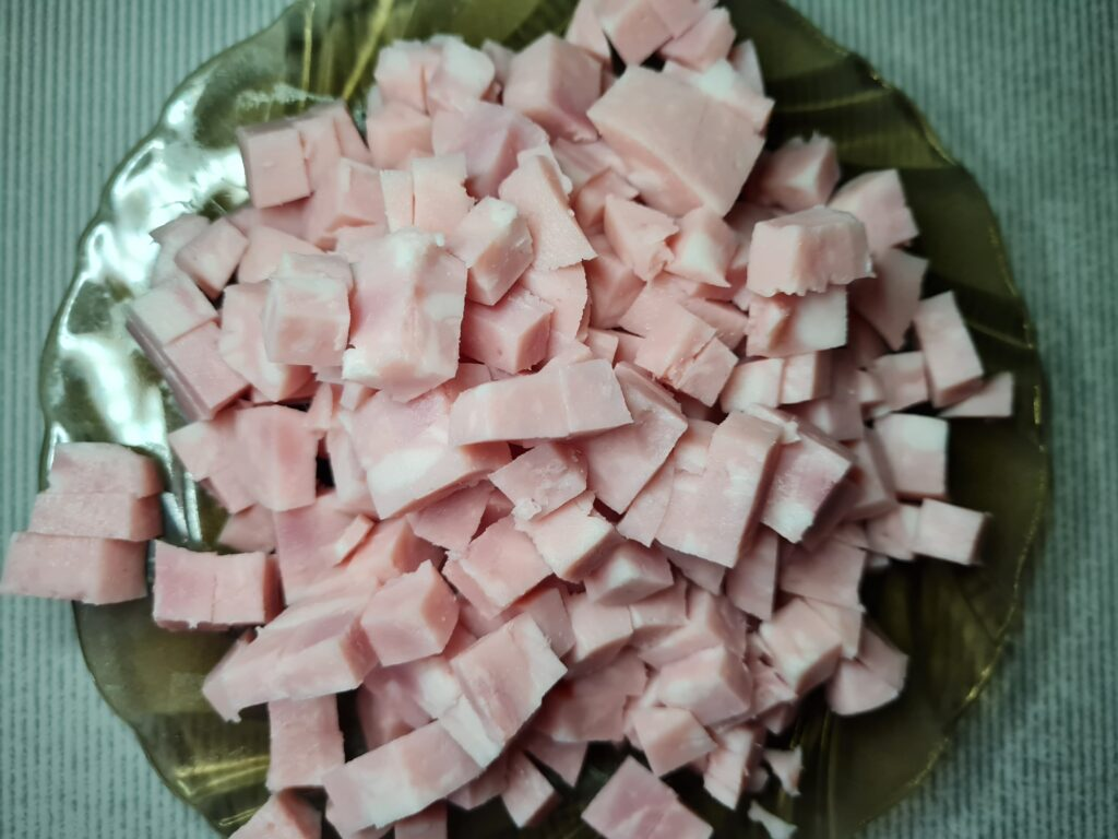 - Ветчину можно брать любую, по вашему вкусу. Нарезать её небольшими кубиками.