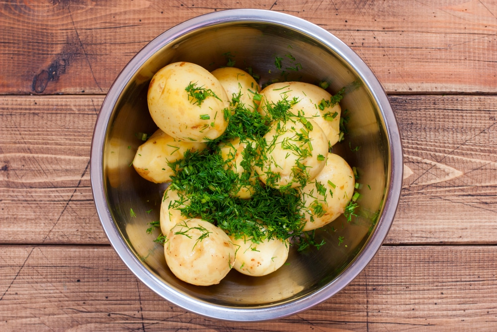 - Картофель моем и прокалываем зубочисткой в разных местах, укроп промываем и мелко нарезаем. Чеснок очистить и пропустить через чеснокодавилку. Смешать всё в кастрюле.
