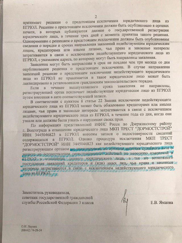 В продолжение темы хочу поделиться информацией о двойных подходах в стандартах работы Дзержинской ИФНС. Есть такое муниципальное Казенное предприятие Трест "Дормостстрой" ИНН 3445046823. В выписке ЕГРЮЛ содержатся записи о недостоверности сведений об адресе (место нахождения), ( ГРН и дата внесения в ЕГРЮЛ записи, содержащей указанные сведения №2183443383165 от 03.05.2018г.), а также Сведения о лице, имеющем право без доверенности действовать от имени юридического лица ( ГРН и дата внесения в ЕГРЮЛ записи, содержащей указанные сведения № 2183443269117 10.04.2018г.). Бухотчетность не предоставлялась за 2016,2017,2018г., имеет задолженность по налогам более 20 млн.