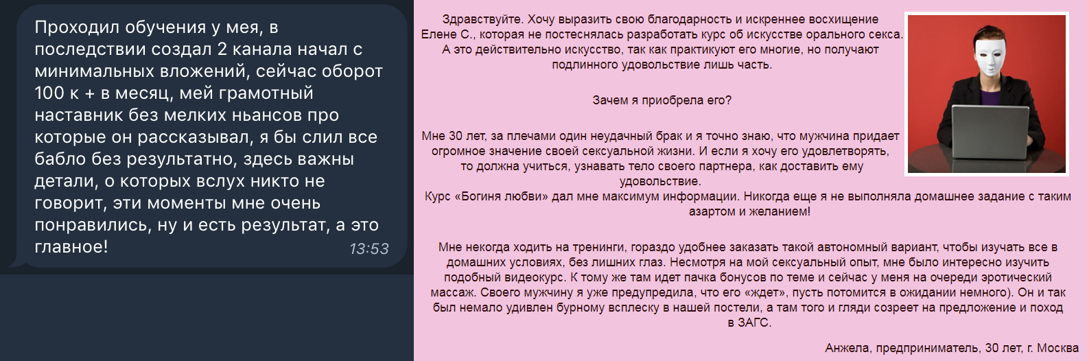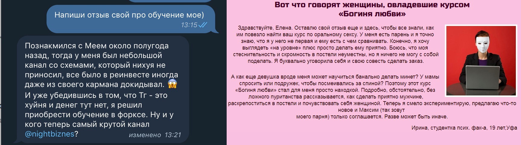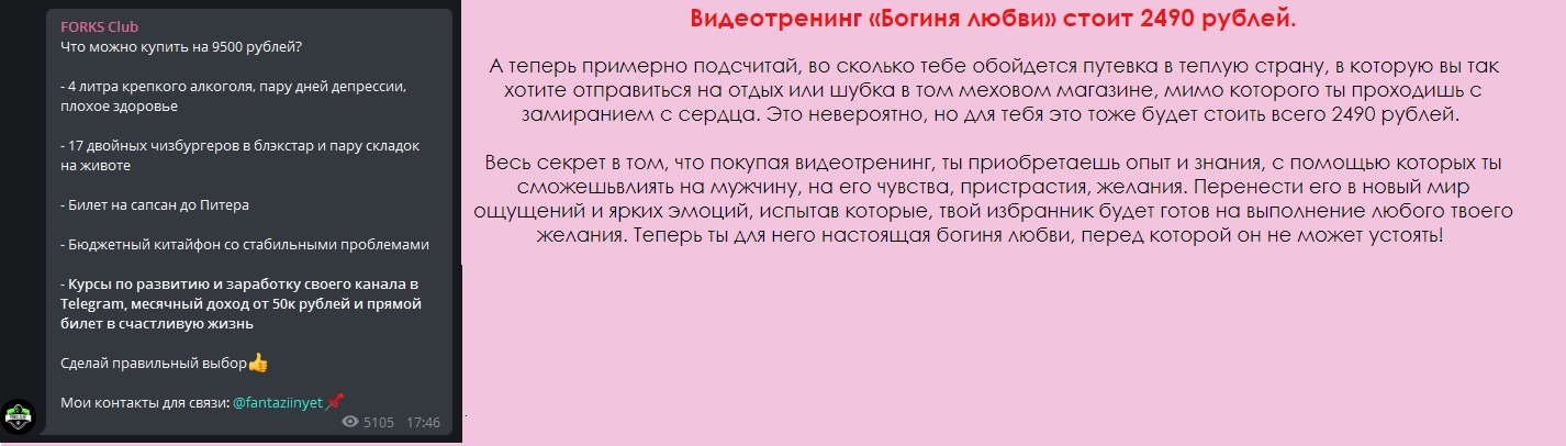 Впрочем, на этот раз у обучения есть отзывы. И даже, в отличие от темы со спецтехникой, отзывы оставили настоящие админы каналов. Это конечно не повод поверить в реальную пользу обучения, это всего лишь список таких же нечистоплотных дельцов, не опасающихся за свою репутацию. Все эти каналы в разное время рекламировались на @forkstg. Обратите внимание на содержательность отзывов (её нет совсем) тексты у всех одинаковые: "ну я там веду канал хуе-мое, купил обучение у @forkstg и теперь у меня 20к подписчиков и я крутой". Кстати, эти отзывы мне напомнили рекламу другой сомнительной херни. Как говорится, найди 10 отличий :)