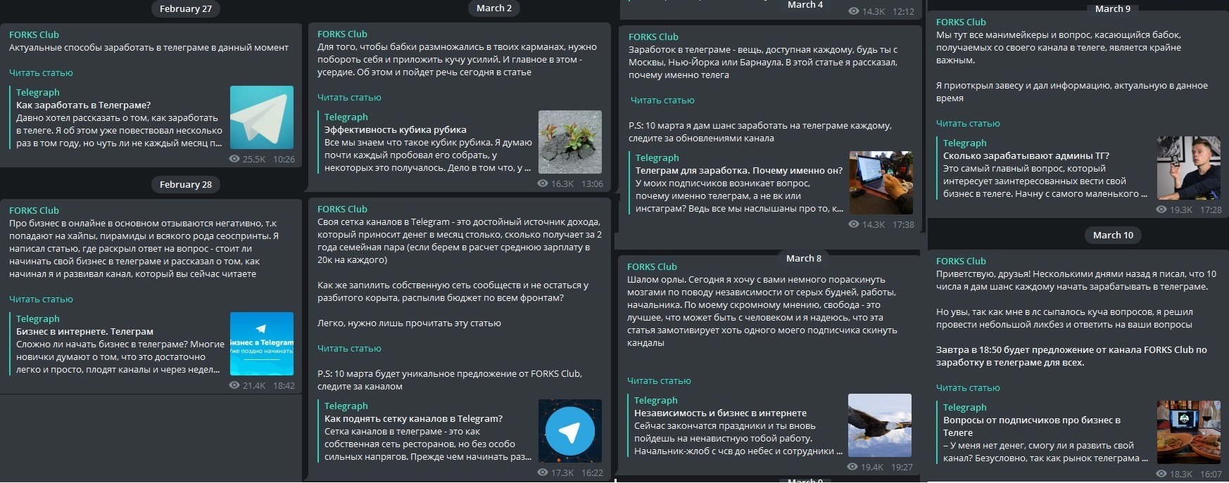 Вообще May (@forkstg) не отличается оригинальностью и креативом, хотя постоянно в своих текстах пиздит о важности творческого подхода, сам он следует банальным лекалам развода. Месяц назад, в феврале, он вызвался обучать такому невъебенно сложному делу как посредничество в аренде спецтехники (прайс от 30 до 120 тысяч рублей), выдав школьное сочинение за историю успеха. А 11 марта решил учить телеграму, на этот раз 2 недели маринуя подписчиков постами об охуительности и прибыльности телеграма. Цена за обучение, кстати, в этот раз составляет всего лишь 9500 рублей.
