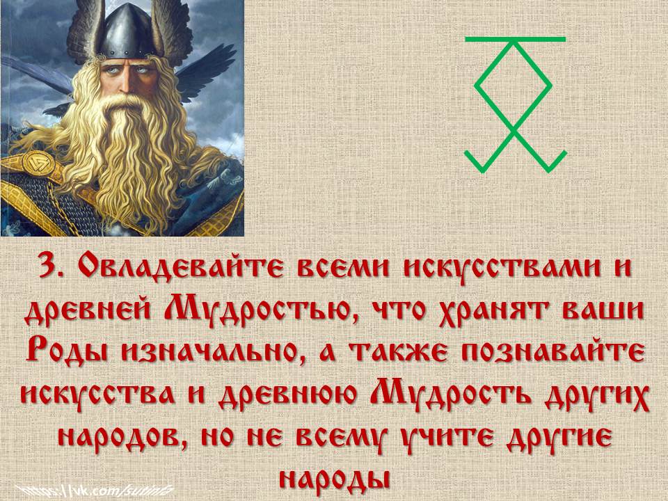 ✅ 16. «Ведайте, люди, что каждый потомок Древних Богов должен иметь Родовую Веру, ясный Разум, пытливый Ум, любящее и храброе Сердце, чистую Совесть, сильные Руки и крепкую Волю».