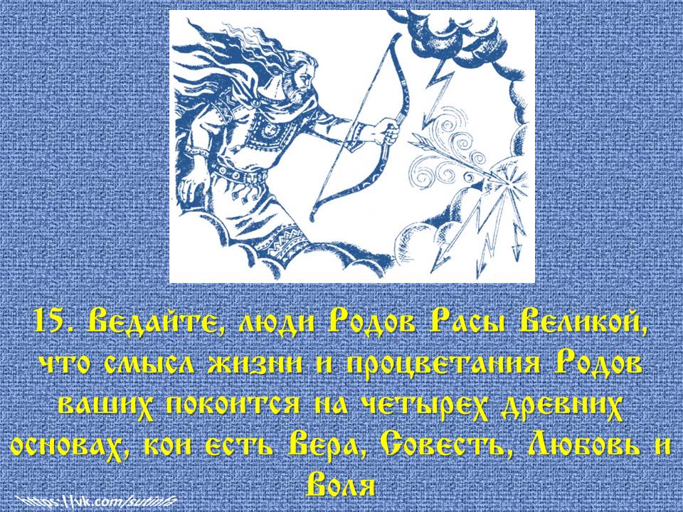✅ 15. «Ведайте, люди Родов Расы Великой, что смысл жизни и процветания Родов ваших покоится на четырех древних основах, кои есть Вера, Совесть, Любовь и Воля».