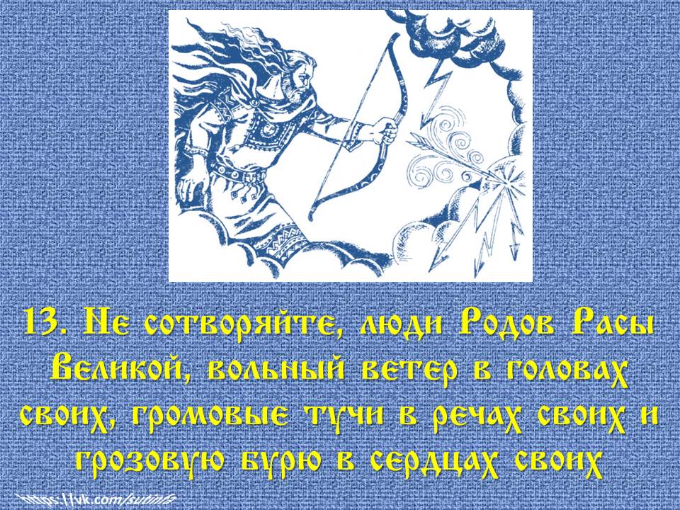✅ 13. «Не сотворяйте, люди Родов Расы Великой, вольный ветер в головах своих, громовые тучи в речах своих и грозовую бурю в сердцах своих».