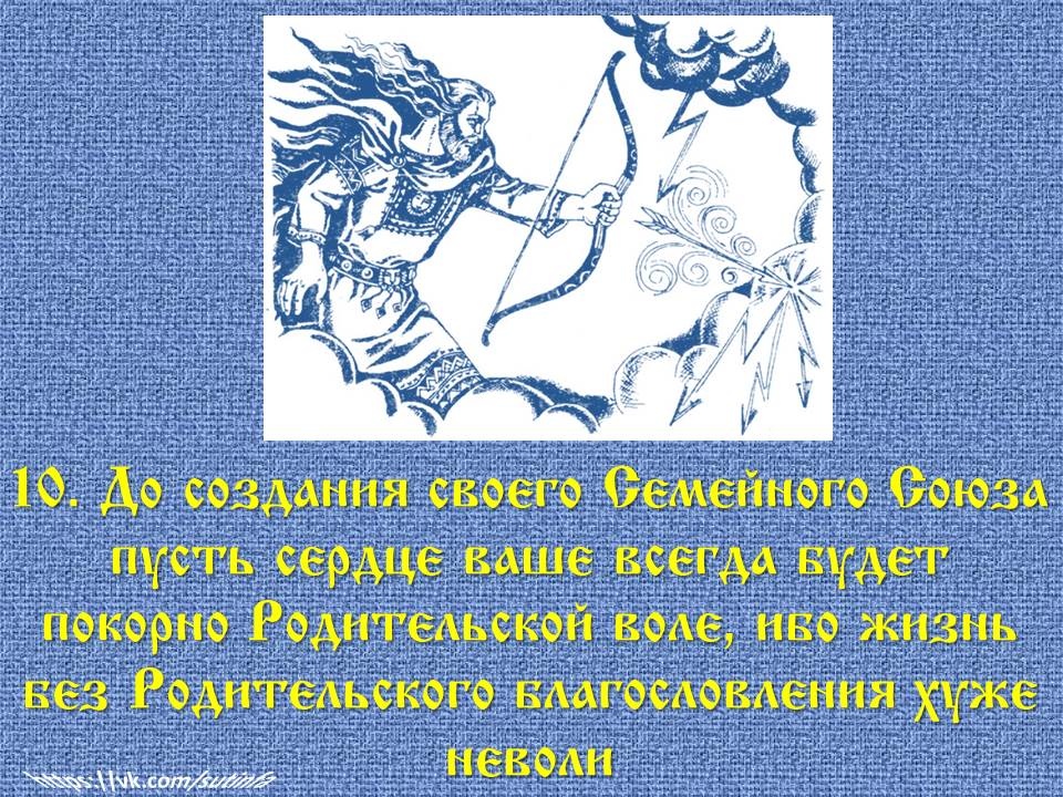 ✅ 10. «До создания своего Семейного Союза пусть сердце ваше всегда будет покорно Родительской воле, ибо жизнь без Родительского благословления хуже неволи».
