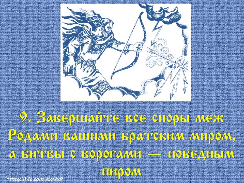 ✅ 9. «Завершайте все споры меж Родами вашими братским миром, а битвы с ворогами — победным пиром».