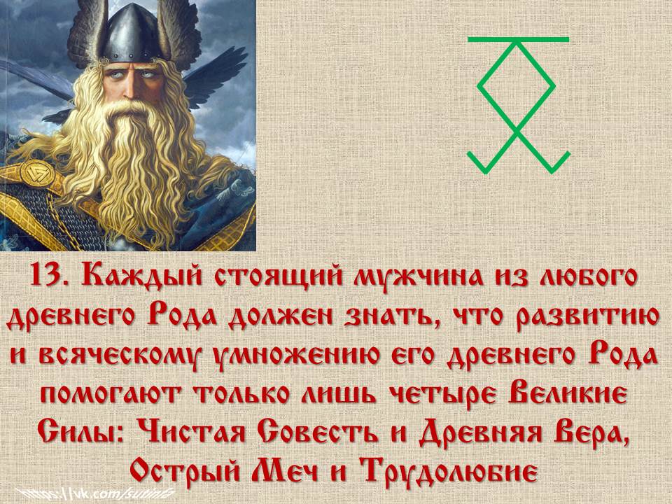 ✅ 13. «Каждый стоящий мужчина из любого древнего Рода должен знать, что развитию и всяческому умножению его древнего Рода помогают только лишь четыре Великие Силы: Чистая Совесть и Древняя Вера, Острый Меч и Трудолюбие».