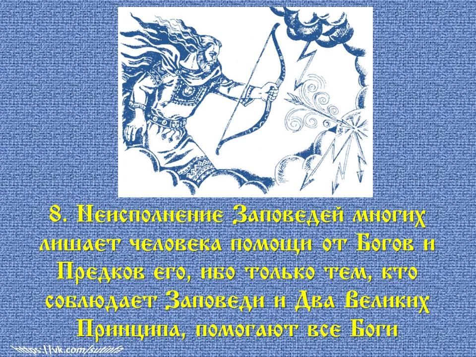 ✅ 8. «Неисполнение Заповедей многих лишает человека помощи от Богов и Предков его, ибо только тем, кто соблюдает Заповеди и Два Великих Принципа, помогают все Боги».