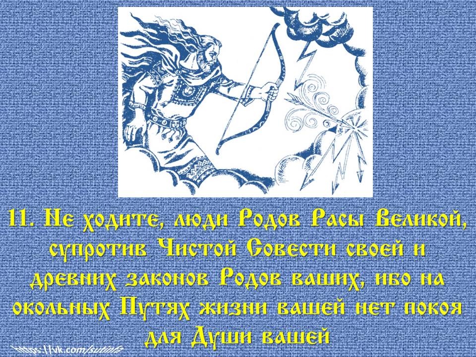 ✅ 11. «Не ходите, люди Родов Расы Великой, супротив Чистой Совести своей и древних законов Родов ваших, ибо на окольных Путях жизни вашей нет покоя для Души вашей».