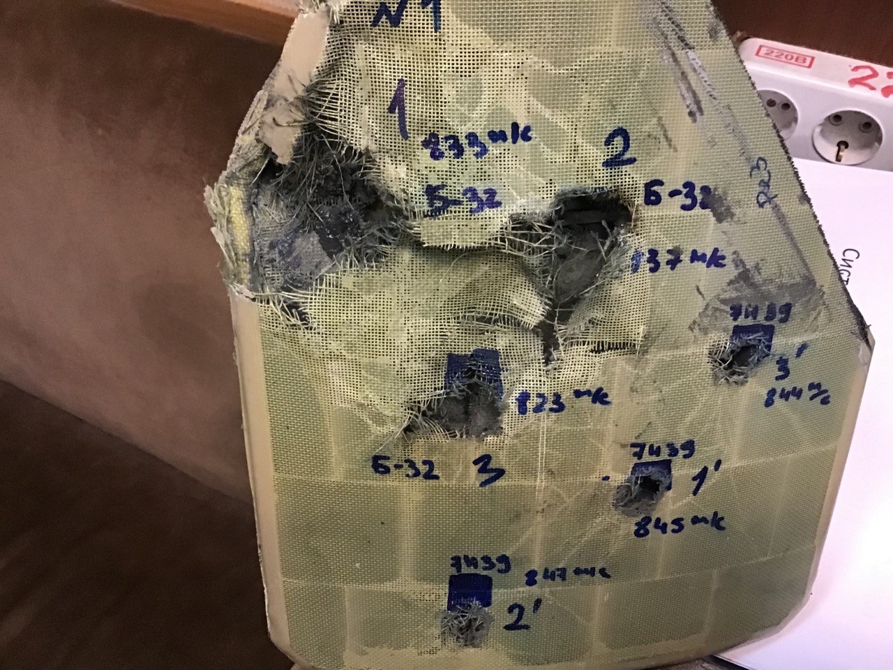 Фиксировалась скорость пуль Vз , измеренная на расстоянии 3 метров от дульного среза оружия. После каждого выстрела производился осмотр испытываемого образца, оценивался результат воздействия пули (Пробитие/Непробитие) для каждого выстрела. Результаты испытаний представлены в таблице .1