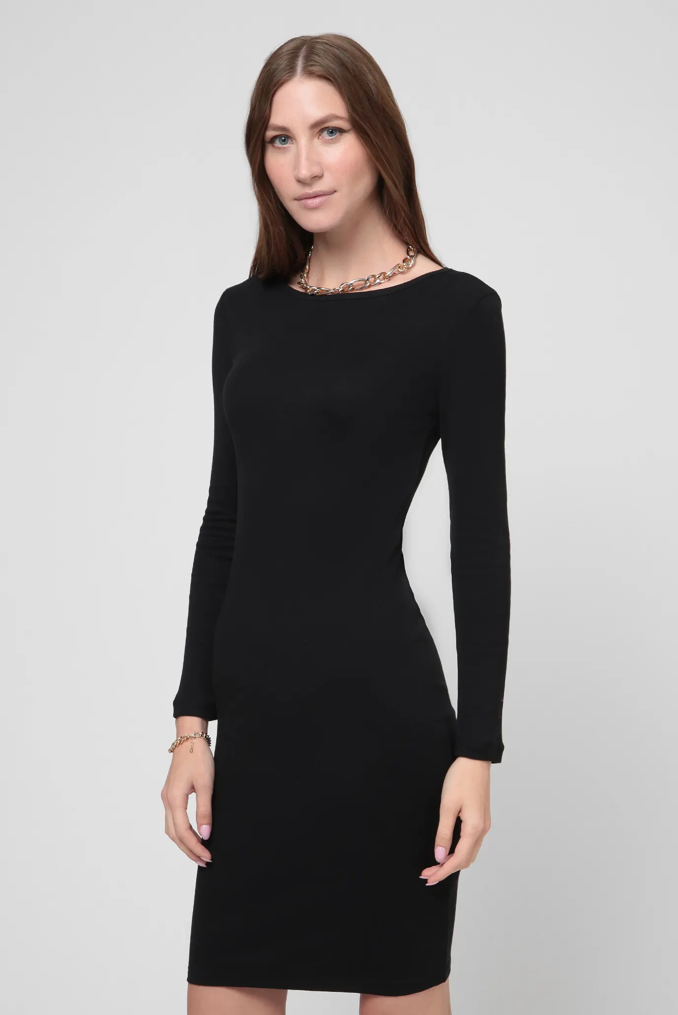Классическое черное платье футляр, приятное к телу, украшено камнями