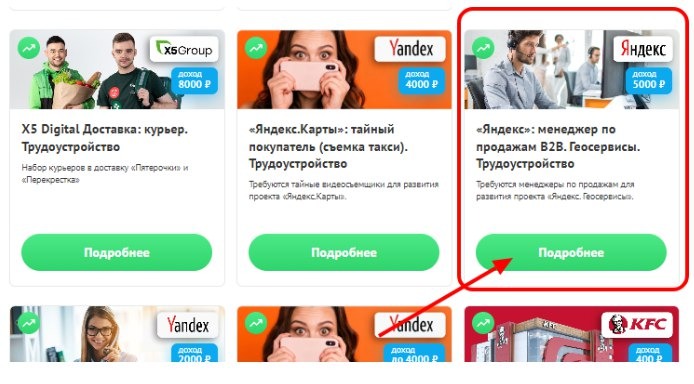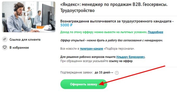 Находим наш оффер, например Менеджер по продажам в Яндекс, как видим он платит 5000р за привлеченного работника.