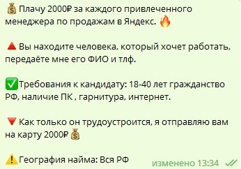 Далее идем на доски объявлений, например в телеграм чаты (работа москва чат и. т.п) и пишем примерно такой текст.