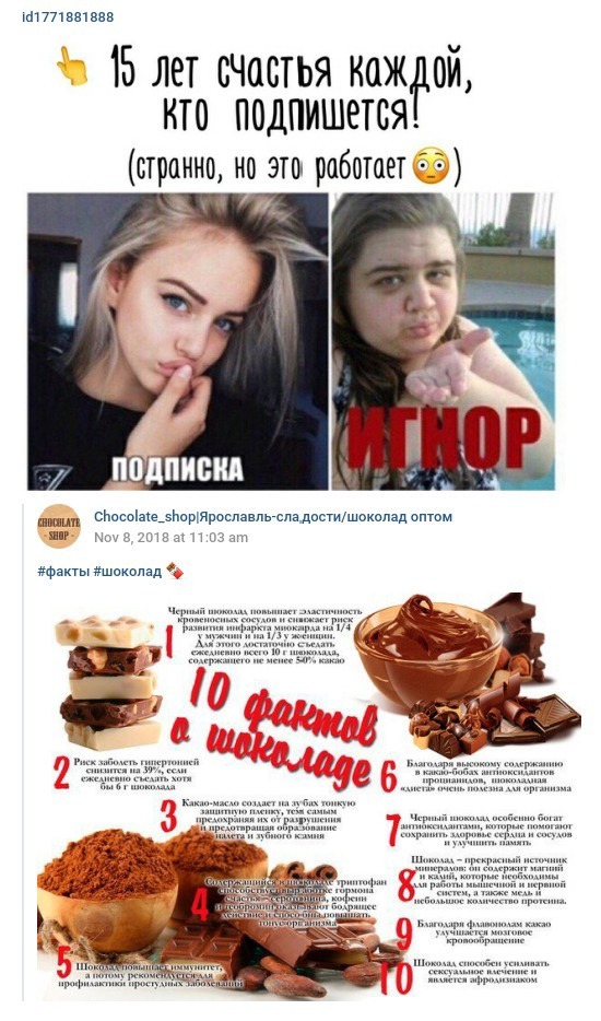 Думаю вы понимаете, что настраивая рекламу, вы знаете пароли от аккаунта вашего клиента, и обычно я выхожу из них когда не требуется, а тут забыл, и мне пришло оповещение о смс в Директ. Я прочёл и увидел поставщика шоколада, позвонил, узнал цены и вот именно в этот момент произошло «зачатие» моего собственного проекта — https://vk.com/chocshop