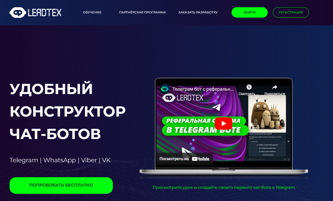 Для создания ChatGPT бота и других идей можно использовать конструкторы тг ботов, и это будет полностью бесплатно. Допустим такой конструктор как LeadTex(Кликабельно).