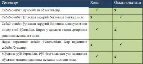 Okkazionalizm va Hyum taʼlimoti bir qarashda juda oʼxshashdek koʼrinsa-da, chuqurroq tekshirilsa, bunday emasligi maʼlum boʼladi. Hyum falsafasi dunyoviy taʼlimot boʼlib, muayyan hodisani tushuntirishda ratsional yoki empirik mulohazalarga tayanadi. Basharti buning iloji boʼlmasa, agnostik mavqeda qoladi. Okkazionalizm esa mohiyatan absolyutist taʼlimotdir. U barcha narsaning muqarrar izohini Xudo gʼoyasiga bogʼlab beradi. Sharqda Gʼazzoliy va Gʼarbda Dekart kabi faylasuflar okkazionalizm bayrogʼi ostida bir mavqeni himoya qilgan boʼlsa ehtimol, biroq Hyum ham bu borada ularga maslakdosh deyish, bizningcha, haqiqatdan ancha olis.