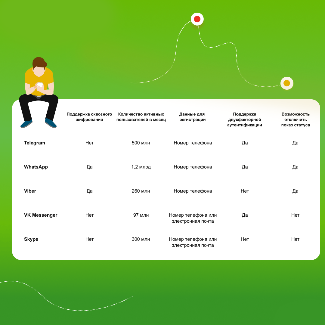 В исследовании мы умышленно не брали во внимание политику конфиденциальности, потому что большинство мессенджеров так или иначе кому-то передают наши данные. Окончательное решение, с кем делиться информацией, остается за пользователем. Вы просто выбираете, кому доверяете больше: Facebook, Mail.ru или другой компании.