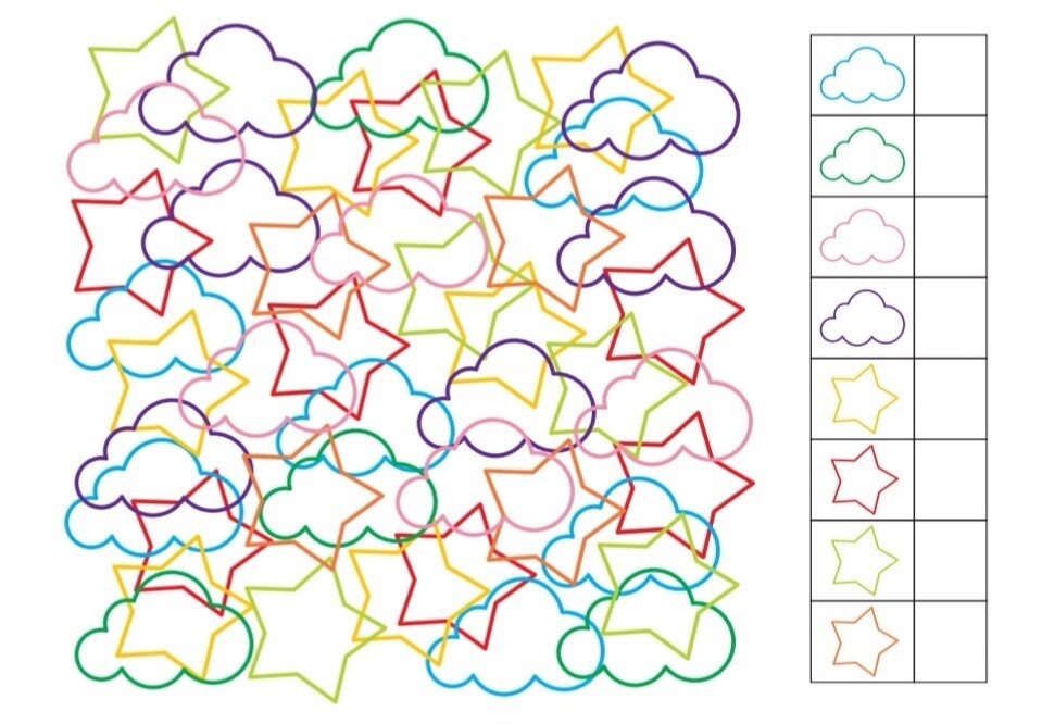 Зашумленные картинки представляют собой контуры наложенных друг на друга геометрических фигур и предметов . В задании необходимо посчитать одинаковые предметы . Игра способствует развитию внимания, зрительной . . .