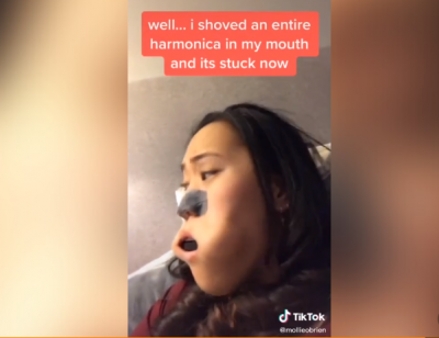 Девушка ради шутки засунула в рот губную гармошку . . .