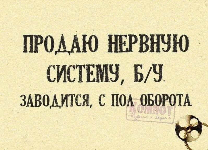 Анекдот №159183. Продается нервная система в отличном состоянии — заводится с пол - оборота . Удалить этот бред! 0. Еще анекдоты. Сидели с .