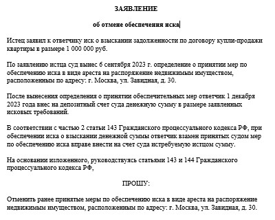 Заявление об отмене ареста имущества