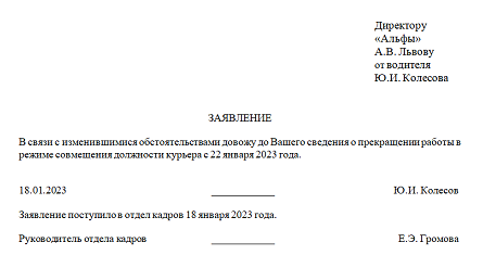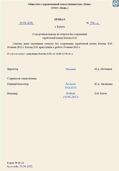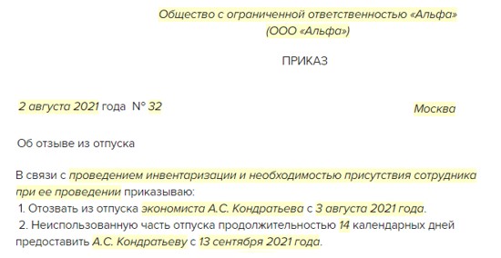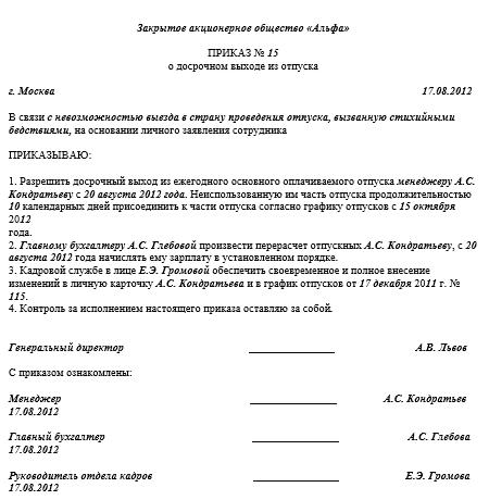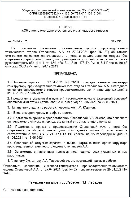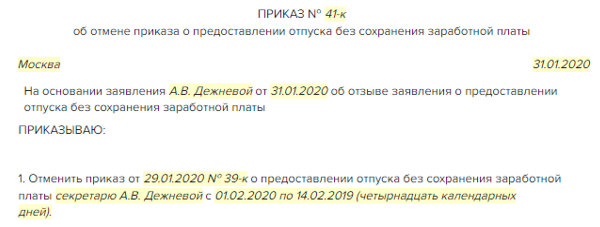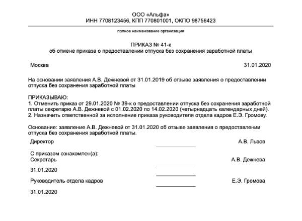 Заявление работника об отмене отпуска